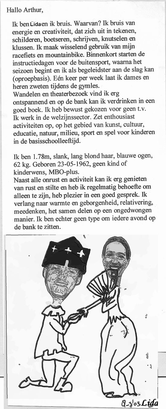 Uit de envelop kwam nog meer een zelfgemaakte kaart met een prins op het witte paard, een prinsesachtig figuurtje met het zwart-witgezicht erboven. Het gezicht van de prins was bedekt met een getekende, gesloten helm, waarin alleen ogen te zien waren. Mijn ogen, zag mijn moeder. “Wat moet een vreemde vrouw met jouw ogen?”. Ze klonk alsof ze een concurrente wilde verslaan en ik vond het knap hoe ze zonder meer mijn ogen herkende. “Van Internet gehaald”, meende ik. Ik vond de vreemde vrouw niet mooi en het knutselwerk vooral kinderlijk naïef. Dat mijn nichtjes zoiets maken om een jongetje uit hun klas een aanzoek te doen, OK, maar een vrouw van 40?